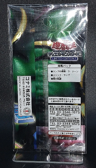 HOME遊戯王 【LIMITED EDITION 3 海馬パック】 2025年12月11日 遊戯王 ミュージアムTOP LIMITED EDITION TOP <解説>2001年5月、週刊少年ジャンプ誌上で実施された応募者全員サービスのパック。 「ラ・ジーン」はイラスト違いで収録。 ウルトラレア仕様で収録されている。 収録内容「ランプの魔精・ラ・ジーン」「マジック・ランプ」「闇の呪縛」 ミュージアムTOP LIMITED EDITION TOP 【LIMITED EDITION 3 遊戯パック】 【LIMITED EDITION 3 城之内パック】